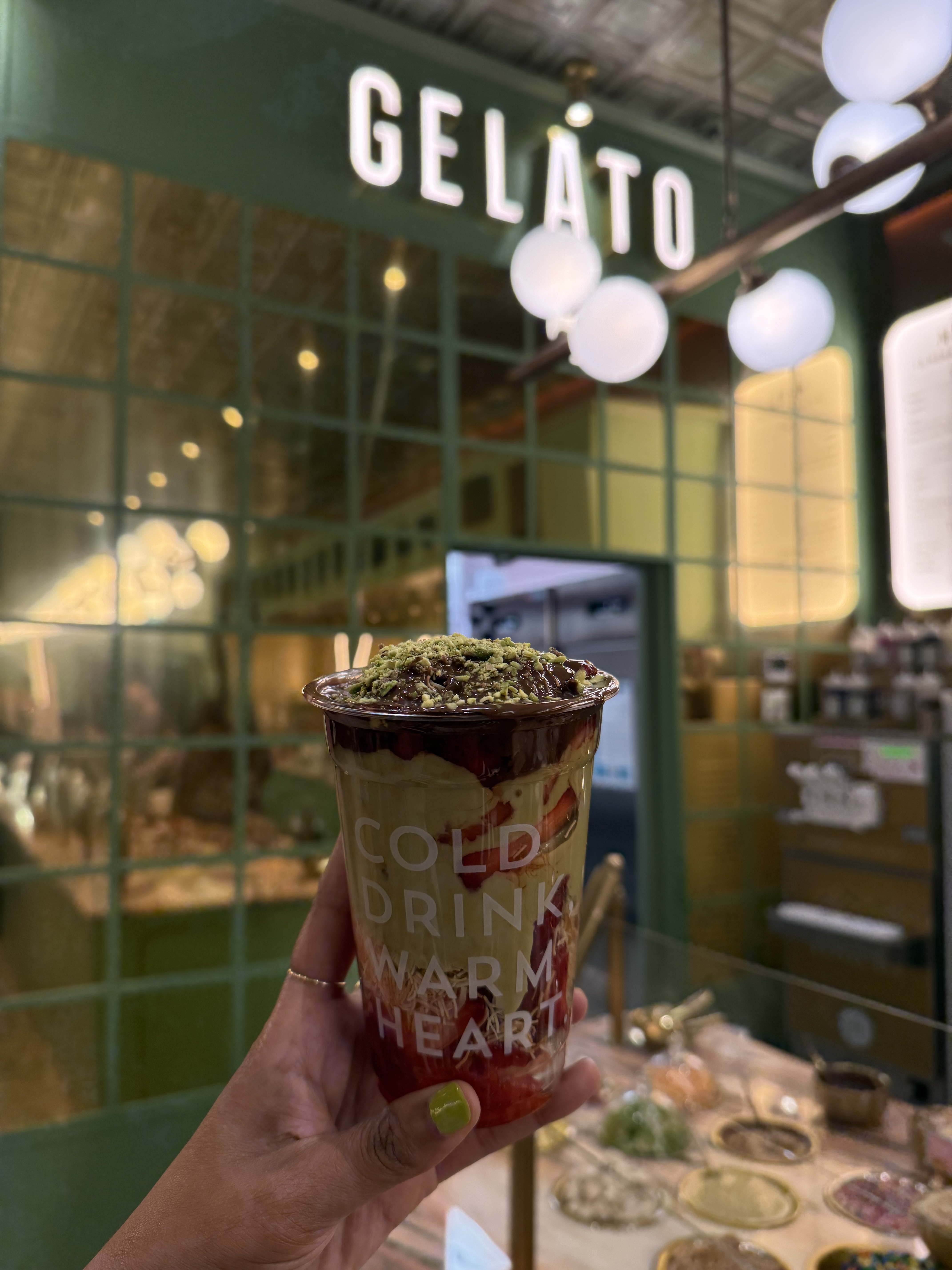 The Mediterranean-inspired, family owned gelato chain puts its own spin on the viral Strawberry Cup. Their version, dubbed the “Greenberry,” features layers upon layers of sliced strawberries, crispy kadaif, chocolate and pistachio cream and roasted pistachios. Want the trend in scoopable form? Go for the “Dubai Chocolate” gelato (not pictured), a milk chocolate base, laced with crunchy kadaif. For full indulgence, don’t skip the pistachio and chocolate cream or crushed pistachio toppings from the customization bar.